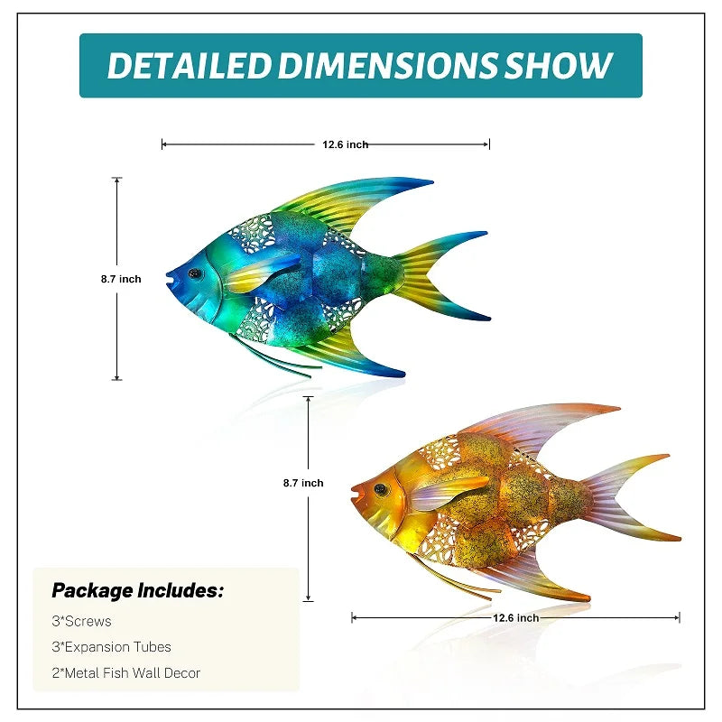 - Coastal-Inspired Design: Features two intricately crafted metal fish sculptures, bringing a nautical, beach-themed aesthetic to enhance indoor or outdoor spaces.