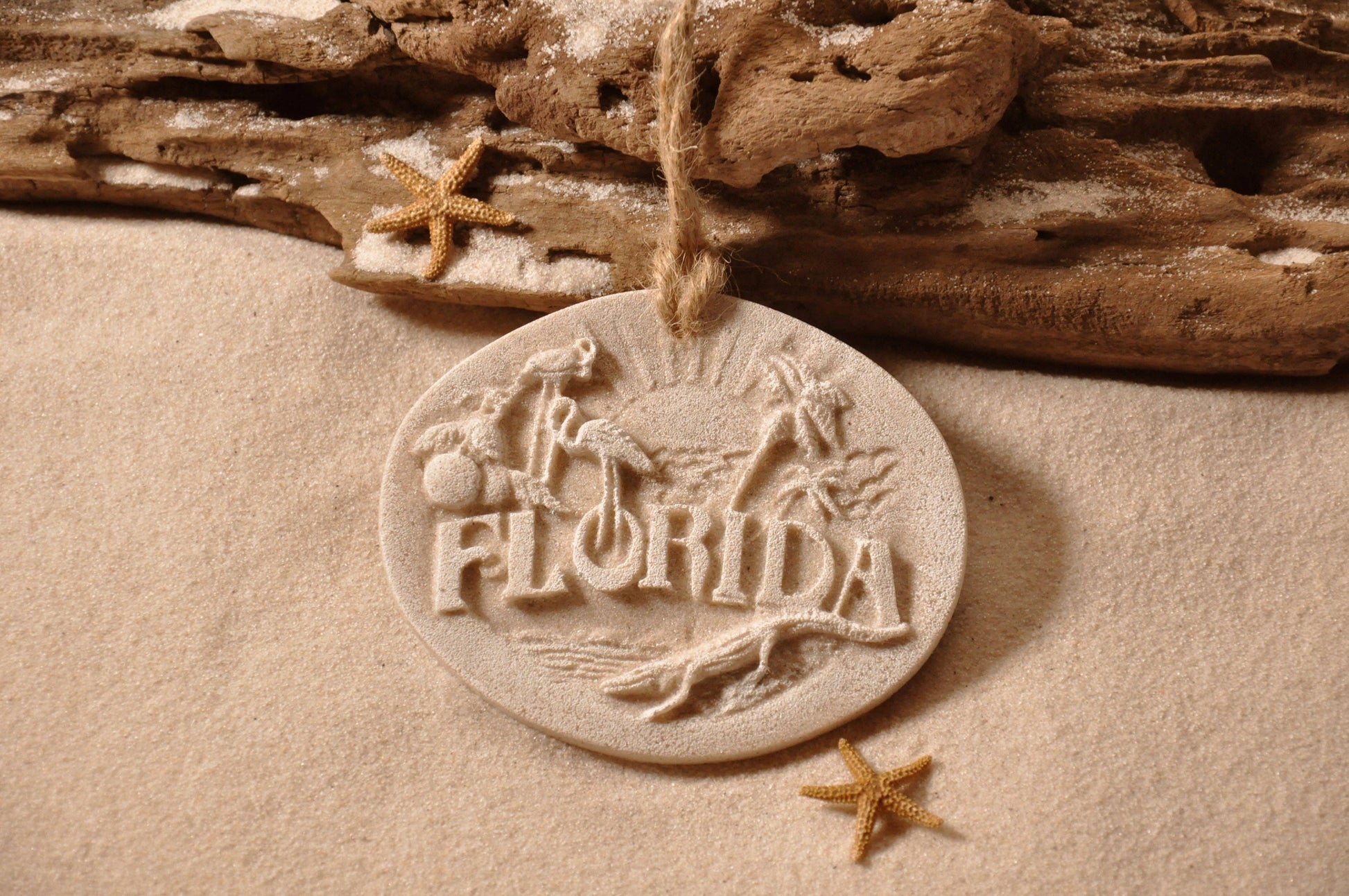 Two styles are available, either with ribbon and glitter (standard ribbon colors are white, turquoise & aqua), or with a jute tie and no glitter for a more coastal look. Name drop is available, please check for availability. They come with a hang tag indicating that they are “Handcrafted with Sand” as well as “Made in Florida USA”.